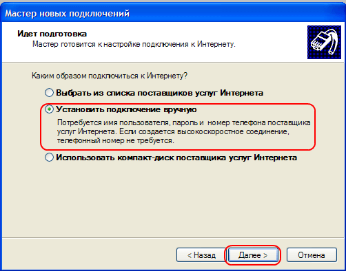 6. Выбираем пункт «Установить подключение вручную», «Далеe»