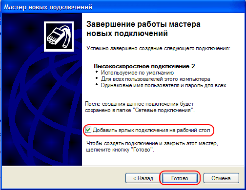 6. Устанавливаем галочку «Добавить ярлык подключения на рабочий стол», «Готово»
