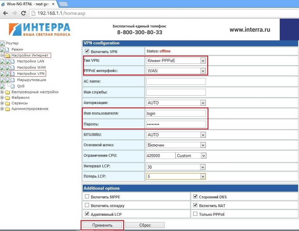 Теперь в правом окне настраиваем подключение. Тип подключения: PPPoE. Вводим логин и пароль который был предоставлен вам при подключении (если у вас есть диск, то данные на нём). Завершаем настройку подключения кнопкой «Применить»