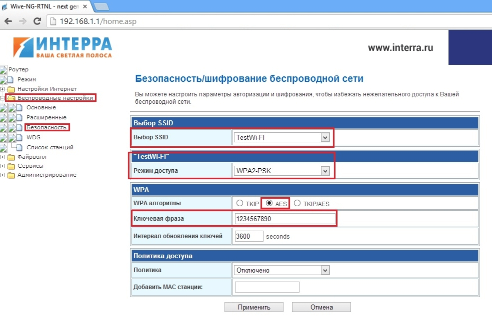 Теперь необходимо поставить пароль на Wi-Fi сеть. В левой колонке открываем «Беспроводные настройки», затем «Безопасность». Выбираем только что созданную вами сеть, меняем режим доступа с «OPEN» на «WPA2-PSK». В пункте WPA алгоритмы устанавливаем точку на «TKIP/AES». В поле «Ключевая фраза» вводим желаемый пароль от Wi-Fi сети (от 8 знаков: цифры, латинские буквы). Снова нажимаем «Применить».