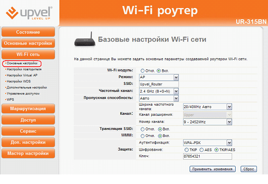 Тогда, вход в сеть – останется без пароля, шифрование – не будет использоваться. Как настроить WiFi роутер Upvel в режим «точка доступа», мы полностью рассмотрели. Не забудьте нажать «Применить изменения», сеть заработает сразу.