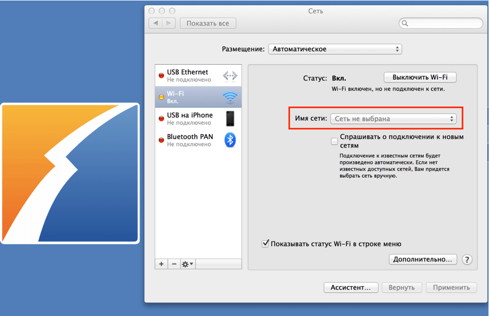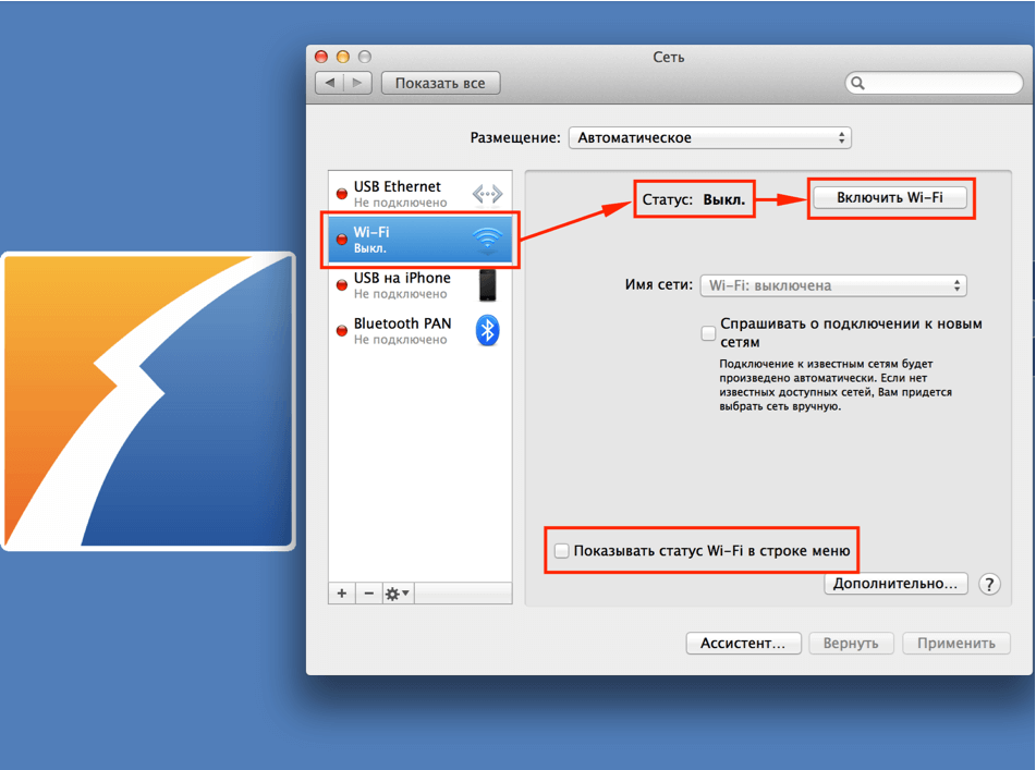 Если «Показывать статус Wi-Fi в строке меню» не активно, то нажимаем на саму надпись левой кнопкой мыши.