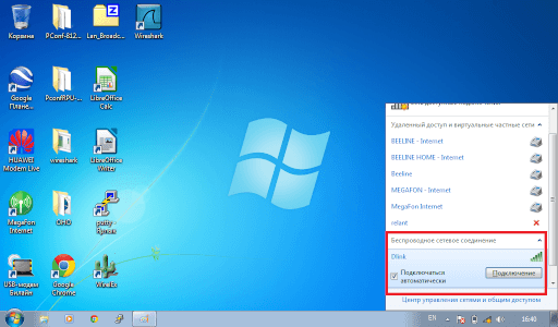 1. В правом нижнем углу рядом с часами находим значoк подключения к сети и нажимаем на него левой кнопкой мыши
