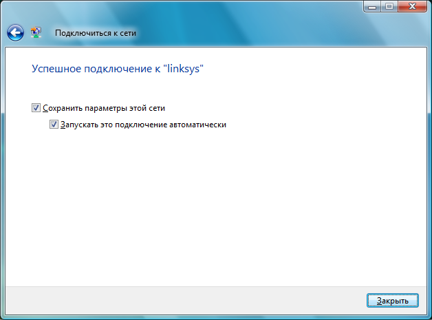 8. В открывшемся окне по умолчанию установлены галочки в пунктах «Сохранить параметры этой сети» и «Запускать это подключение автоматически», которые позволяют избежать процедуры настройки и подключения к беспроводной сети каждый раз при подключении к Интернету. В окне «Управление беспроводными сетями» будет отображаться подключенная беспроводная сеть.