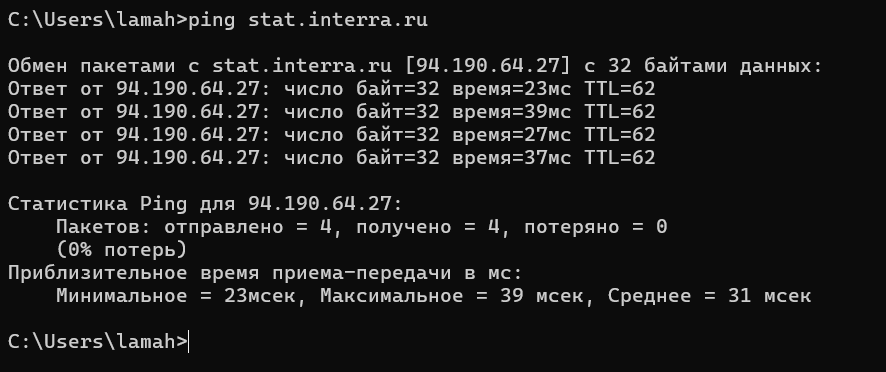 В нашем случае необходимо ввести: ping stat.interra.ru