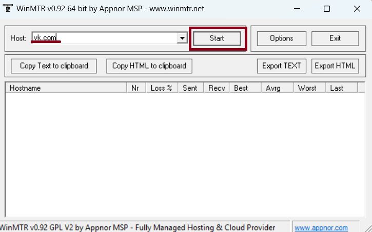 В верхней части программы вписываем узел, до которого необходимо провести проверку. Для примера будет vk.com.