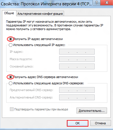 9. В открывшемся окне выставьте параметры IP на автоматическое получение (Получить IP-адрес автоматически). Сохраните изменение путем нажатия кнопки «Ок»