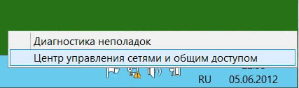 1.3. Правой кнопкой мыши щёлкните по этой иконке, в появившемся меню выберите «Центр управления сетями и общим доступом»: